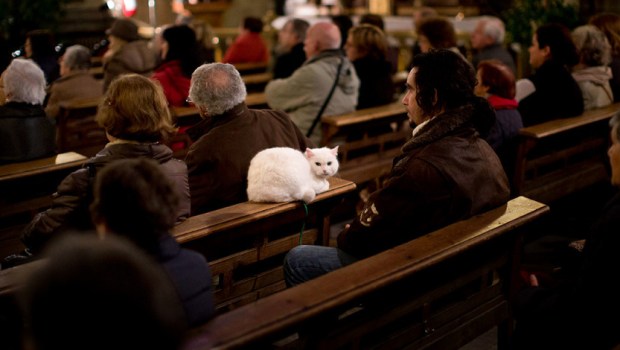 Madryt, Hiszpania: Kot siedzi na ławce w czasie Mszy Świętej w kościele św. Antoniego w Madrycie. To święto patrona zwierząt, podczas którego tysiące ludzi przynosi swoich pupili do kościoła, aby je pobłogosławić.