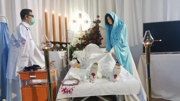 Towarzyszy Mu Maryja, która oddaje Go w ręce lekarza w maseczce na twarzy, stojącego po drugiej stronie łóżka. Obok Jezusa leży zdjęta zakrwawiona korona cierniowa. Wokół widać sprzęty szpitalne i ekran, który pokazuje linię ciągłą – znak, że chory nie żyje.