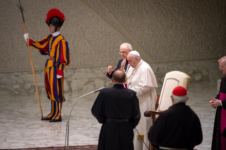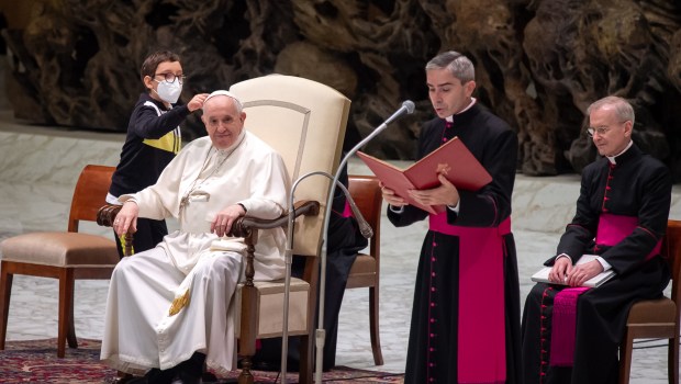 Podczas dzisiejszej audiencji do papieża Franciszka podszedł chłopiec z niepełnosprawnością. Dziecko rozsiadło się na krześle przygotowanym dla jednego z bliskich współpracowników Ojca Świętego.