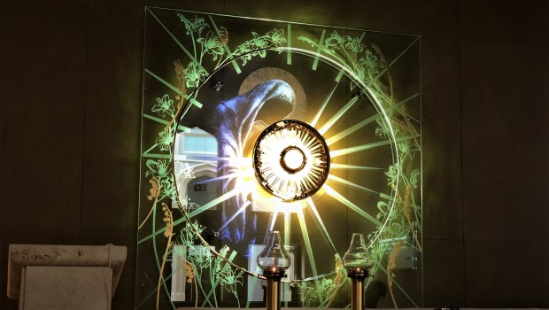W kaplicy widzimy więc delikatną, kryształową taflę z wizerunkiem Maryi, która tuli i całuje swego Syna. Otwarte ramiona Matki otaczają kustodię z białą Hostią, a Jezus Eucharystyczny znajduje się w centrum tej kompozycji.
