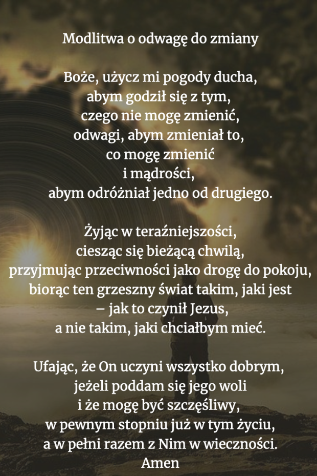 Modlitwa o odwagę do zmiany. „Boże, użycz mi pogody ducha, abym godził się z tym, czego nie mogę zmienić".