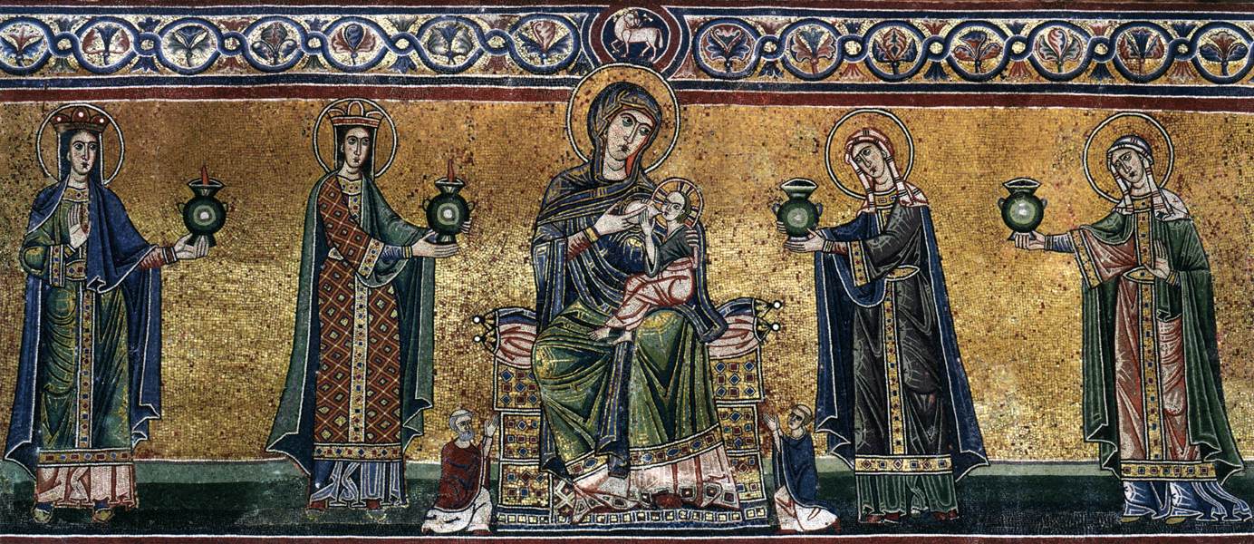 W sztuce średniowiecznej jednym z przykładów Madonny karmiącej jest XII-wieczna mozaika na fasadzie kościoła Santa Maria in Trastevere w Rzymie. Przedstawia Dziewicę podającą pierś Dzieciątku. Wokół Niej jest dziesięć kobiet. Osiem z nich ma na sobie królewskie stroje, dwie są ubrane zwyczajnie. Historycy sztuki uważają, że to nawiązanie do przypowieści o dziesięciu pannach. Dziesięć dziewic czeka na oblubieńca, pięć zapomina o zabraniu lampy i oliwy. Nie mogą więc spotkać pana młodego, który przybywa późną nocą.