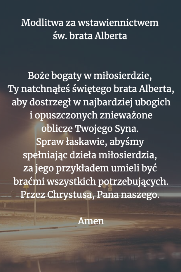 „Spraw, abyśmy za jego przykładem umieli być braćmi wszystkich potrzebujących”. Modlitwa za wstawiennictwem św. Brata Alberta Chmielowskiego.