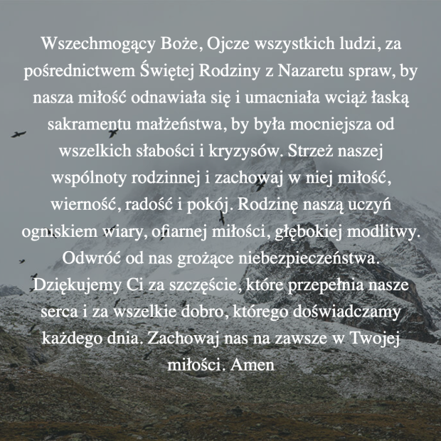 „Rodzinę naszą uczyń ogniskiem wiary, ofiarnej miłości, głębokiej modlitwy”. Modlitwa o pogłębienie miłości małżeńskiej.