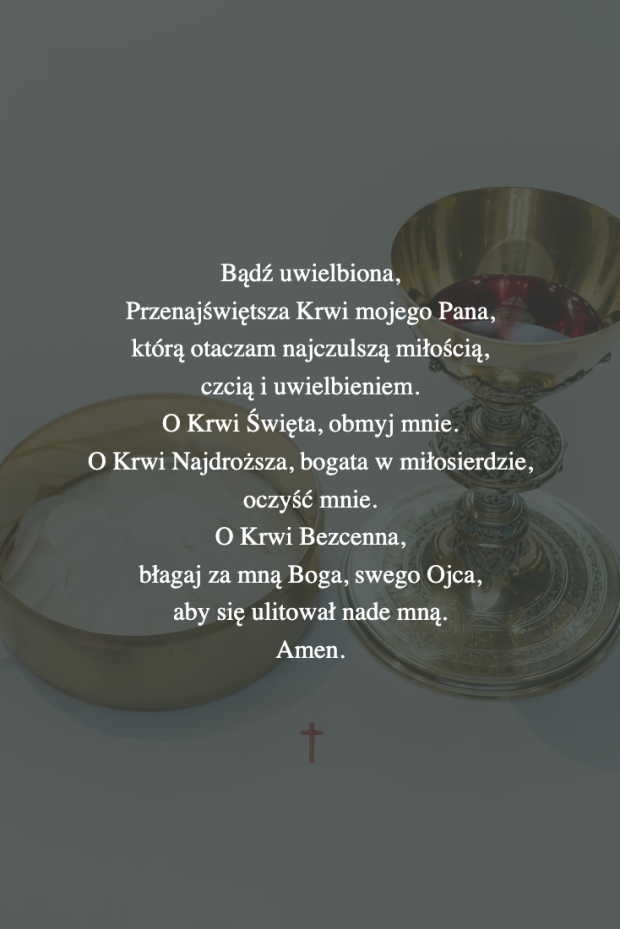 „O Krwi Najdroższa, bogata w miłosierdzie, oczyść mnie” – wezwania do Przenajświętszej Krwi Pana Jezusa.