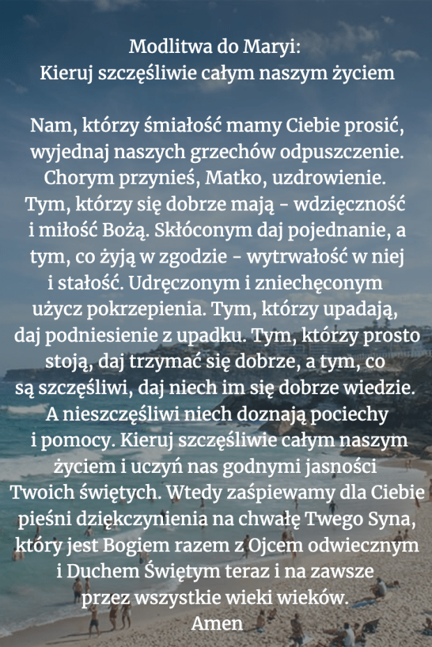 „Chorym przynieś, Matko, uzdrowienie. Tym, którzy się dobrze mają – wdzięczność i miłość Bożą. Skłóconym daj pojednanie, a tym, co żyją w zgodzie – wytrwałość w niej i stałość”.
