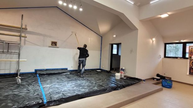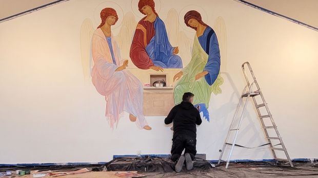 Roman Zięba: Tak. W Pleśnej pod Kołobrzegiem. Wykonywałem dużą polichromię ikony Rublowa — 3,5 metra, może prawie 4. Konsultowałem to z biskupami. Biskup Dajczak miał tę pracę pod duchową opieką, modlił się za mnie.